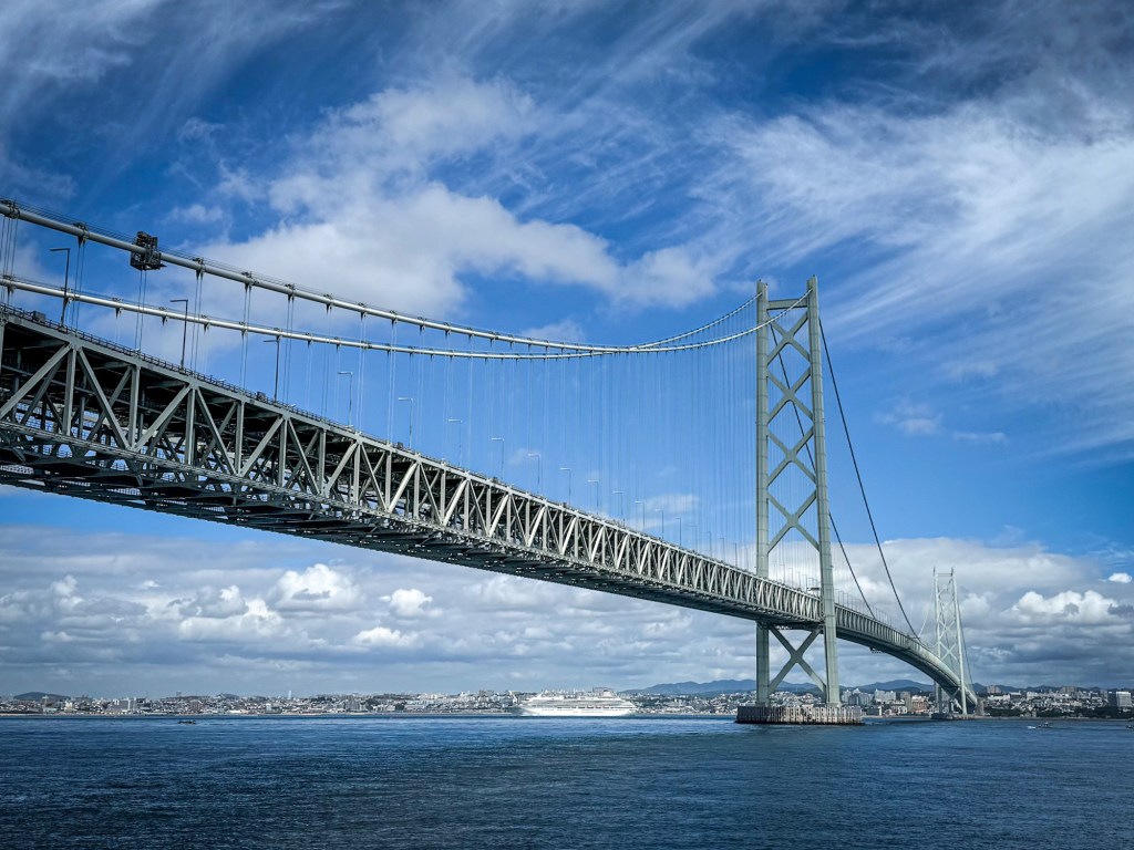 After driving north of Kobe the previous day, we decided to head south today, which meant crossing the enormous Akashi Kaikyo Bridge toward Awaji Island. The plan was to admire the bridge and then drive counterclockwise around the island, searching for spots to stop for lunch and, later, dessert along the way.
