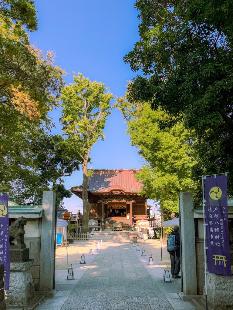 Next, we strolled to the neighborhood temple, Hachiman Jinja. It’s a small Shinto temple with a charming walkway, a restaurant, and sometimes a pop-up café. Today there was a small storytelling performance for kids, which was interesting. The temple itself sits near the edge of a tiny, almost unnoticeable cliff, just a stone’s throw away from our next stop, Togoshi Ginza.